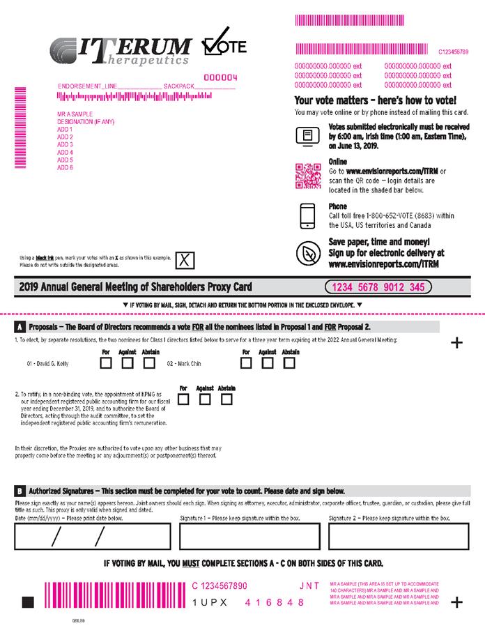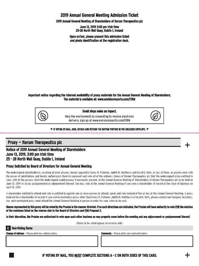 This proxy statement is furnished in connection with the solicitation of proxies by the board of directors (the "board of directors" or the "board") of Iterum Therapeutics plc (the "Company", "Iterum", "we" or "us") for use at the 2019 Annual General Meeting of Shareholders (the "AGM") to be held on June 13, 2019, beginning at 3:00 p.m., Irish time (10:00 a.m., Eastern Time), at the offices of A&L Goodbody at 25-28 North Wall Quay, Dublin 1, Ireland, and at any adjournment or postponement thereof. On April 15, 2019, the record date for the determination of shareholders entitled to vote at the AGM, there were issued, outstanding and entitled to vote an aggregate of 14,369,218 of our ordinary shares, par value $0.01 per share ("ordinary shares"). Each ordinary share entitles the record holder thereof to one vote on each of the matters to be voted on at the AGM.