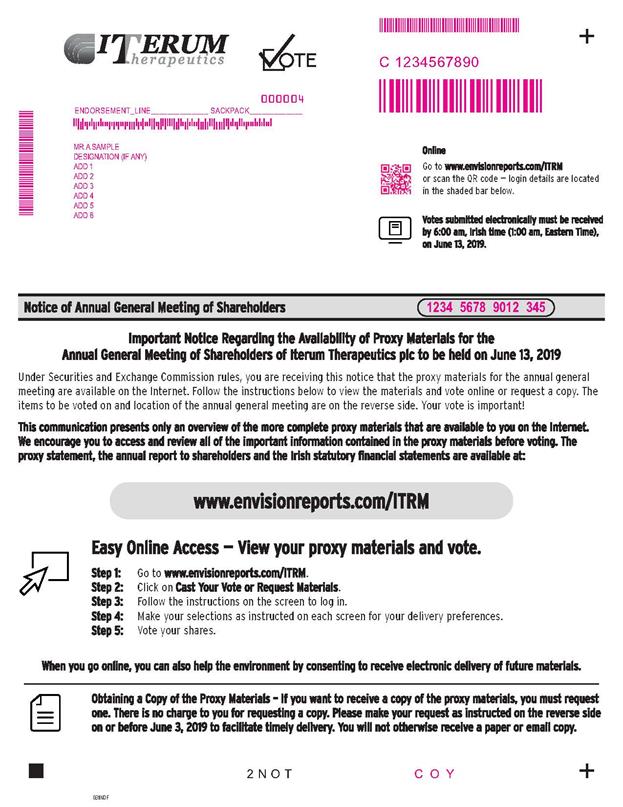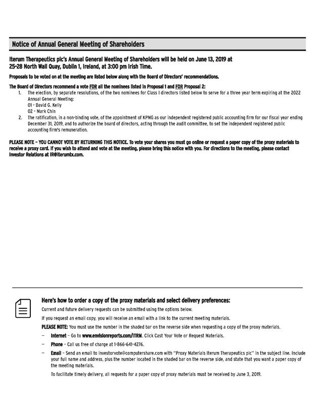 Notice of Annual General Meeting of Shareholders Iterum Therapeutics plc’s Annual General Meeting of Shareholders will be held on June 13, 2019 at 25-28 North Wall Quay, Dublin 1, Ireland, at 3:00 pm Irish Time. Proposals to be voted on at the meeting are listed below along with the Board of Directors’ recommendations. The Board of Directors recommend a vote FOR all the nominees listed in Proposal 1 and FOR Proposal 2: 1. The election, by separate resolutions, of the two nominees for Class I directors listed below to serve for a three year term expiring at the 2022 Annual General Meeting: 01 - David G. Kelly 02 - Mark Chin 2. The ratification, in a non-binding vote, of the appointment of KPMG as our independent registered public accounting firm for our fiscal year ending December 31, 2019, and to authorize the board of directors, acting through the audit committee, to set the independent registered public accounting firm's remuneration. PLEASE NOTE – YOU CANNOT VOTE BY RETURNING THIS NOTICE. To vote your shares you must go online or request a paper copy of the proxy materials to receive a proxy card. If you wish to attend and vote at the meeting, please bring this notice with you. For directions to the meeting, please contact Investor Relations at IR@iterumtx.com. Here’s how to order a copy of the proxy materials and select delivery preferences: Current and future delivery requests can be submitted using the options below. If you request an email copy, you will receive an email with a link to the current meeting materials. PLEASE NOTE: You must use the number in the shaded bar on the reverse side when requesting a copy of the proxy materials. Internet – Go to www.envisionreports.com/ITRM. Click Cast Your Vote or Request Materials. Phone – Call us free of charge at 1-866-641-4276. Email – Send an email to investorvote@computershare.com with “Proxy Materials Iterum Therapeutics plc” in the subject line. Include your full name and address, plus the number located in the shaded bar on the reverse side, and state that you want a paper copy of the meeting materials. To facilitate timely delivery, all requests for a paper copy of proxy materials must be received by June 3, 2019.