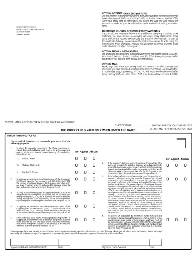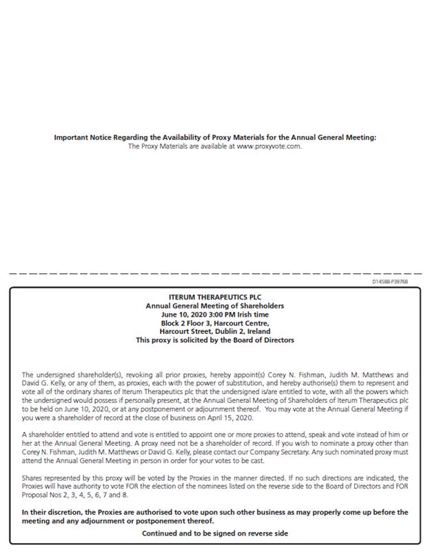 Important Notice Regarding the Availability of Proxy Materials for the Annual General Meeting: The Proxy Materials are available at www.proxyvote.com. D14588-P39768 ITERUM THERAPEUTICS PLC Annual General Meeting of Shareholders June 10, 2020 3:00 PM Irish time Block 2 Floor 3, Harcourt Centre, Harcourt Street, Dublin 2, Ireland This proxy is solicited by the Board of Directors The undersigned shareholder(s), revoking all prior proxies, hereby appoint(s) Corey N. Fishman, Judith M. Matthews and David G. Kelly, or any of them, as proxies, each with the power of substitution, and hereby authorise(s) them to represent and vote all of the ordinary shares of Iterum Therapeutics plc that the undersigned is/are entitled to vote, with all the powers which the undersigned would possess if personally present, at the Annual General Meeting of Shareholders of Iterum Therapeutics plc to be held on June 10, 2020, or at any postponement or adjournment thereof. You may vote at the Annual General Meeting if you were a shareholder of record at the close of business on April 15, 2020. A shareholder entitled to attend and vote is entitled to appoint one or more proxies to attend, speak and vote instead of him or her at the Annual General Meeting. A proxy need not be a shareholder of record. If you wish to nominate a proxy other than Corey N. Fishman, Judith M. Matthews or David G. Kelly, please contact our Company Secretary. Any such nominated proxy must attend the Annual General Meeting in person in order for your votes to be cast. Shares represented by this proxy will be voted by the Proxies in the manner directed. If no such directions are indicated, the Proxies will have authority to vote FOR the election of the nominees listed on the reverse side to the Board of Directors and FOR Proposal Nos 2, 3, 4, 5, 6, 7 and 8. In their discretion, the Proxies are authorised to vote upon such other business as may properly come up before the meeting and any adjournment or postponement thereof. Continued and to be signed on reverse side