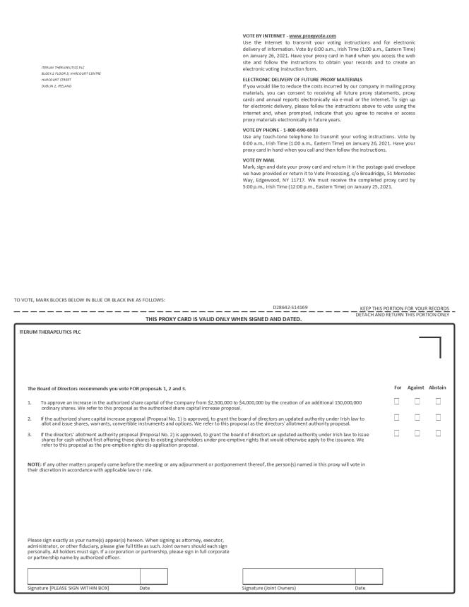 ITERUM THERAPEUTICS PLC BLOCK 2 FLOOR 3, HARCOURT CENTRE HARCOURT STREET DUBLIN 2, IRELAND VOTE BY INTERNET - www.proxyvote.com Use the Internet to transmit your voting instructions and for electronic delivery of information. Vote by 6:00 a.m., Irish Time (1:00 a.m., Eastern Time) on January 26, 2021. Have your proxy card in hand when you access the web site and follow the instructions to obtain your records and to create an electronic voting instruction form. ELECTRONIC DELIVERY OF FUTURE PROXY MATERIALS If you would like to reduce the costs incurred by our company in mailing proxy materials, you can consent to receiving all future proxy statements, proxy cards and annual reports electronically via e-mail or the Internet. To sign up for electronic delivery, please follow the instructions above to vote using the Internet and, when prompted, indicate that you agree to receive or access proxy materials electronically in future years. VOTE BY PHONE - 1-800-690-6903 Use any touch-tone telephone to transmit your voting instructions. Vote by 6:00 a.m., Irish Time (1:00 a.m., Eastern Time) on January 26, 2021. Have your proxy card in hand when you call and then follow the instructions. VOTE BY MAIL Mark, sign and date your proxy card and return it in the postage-paid envelope we have provided or return it to Vote Processing, c/o Broadridge, 51 Mercedes Way, Edgewood, NY 11717. We must receive the completed proxy card by 5:00 p.m., Irish Time (12:00 p.m., Eastern Time) on January 25, 2021. TO VOTE, MARK BLOCKS BELOW IN BLUE OR BLACK INK AS FOLLOWS: D28642-S14169 KEEP THIS PORTION FOR YOUR RECORDS THIS PROXY CARD IS VALID ONLY WHEN SIGNED AND DATED. DETACH AND RETURN THIS PORTION ONLY ITERUM THERAPEUTICS PLC The Board of Directors recommends you vote FOR proposals 1, 2 and 3. For Against Abstain 1. To approve an increase in the authorized share capital of the Company from $2,500,000 to $4,000,000 by the creation of an additional 150,000,000 ordinary shares. We refer to this proposal as the authorized share capital increase proposal. 2. If the authorized share capital increase proposal (Proposal No. 1) is approved, to grant the board of directors an updated authority under Irish law to allot and issue shares, warrants, convertible instruments and options. We refer to this proposal as the directors' allotment authority proposal. 3. If the directors' allotment authority proposal (Proposal No. 2) is approved, to grant the board of directors an updated authority under Irish law to issue shares for cash without first offering those shares to existing shareholders under pre-emptive rights that would otherwise apply to the issuance. We refer to this proposal as the pre-emption rights dis-application proposal. NOTE: If any other matters properly come before the meeting or any adjournment or postponement thereof, the person(s) named in this proxy will vote in their discretion in accordance with applicable law or rule. Please sign exactly as your name(s) appear(s) hereon. When signing as attorney, executor, administrator, or other fiduciary, please give full title as such. Joint owners should each sign personally. All holders must sign. If a corporation or partnership, please sign in full corporate or partnership name by authorized officer. Signature [PLEASE SIGN WITHIN BOX] Date Signature (Joint Owners) Date