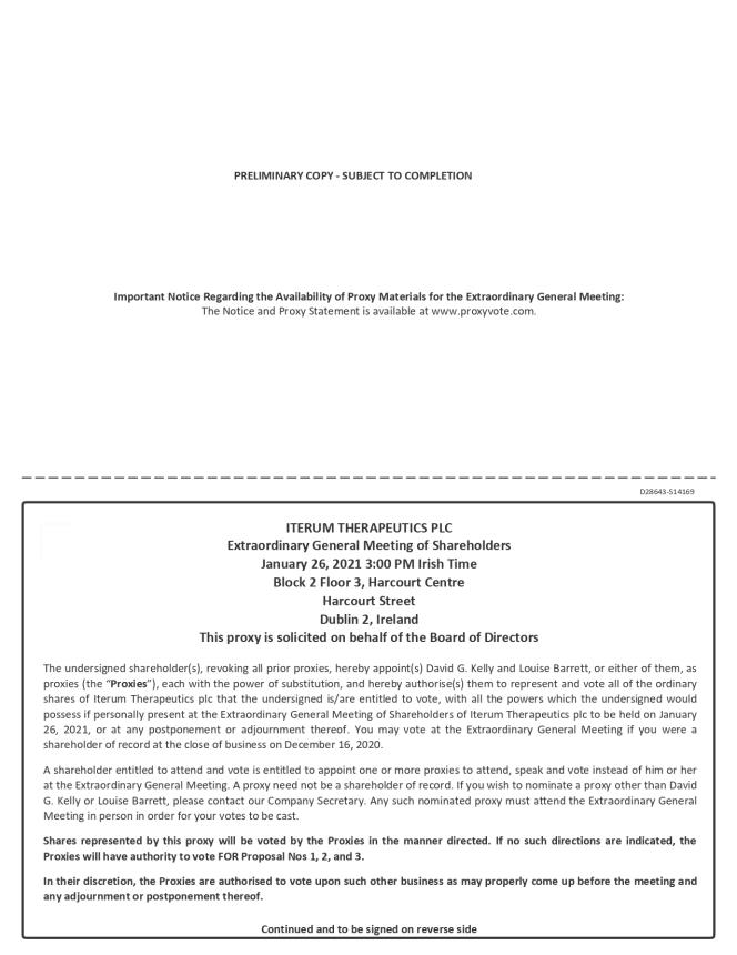 PRELIMINARY COPY - SUBJECT TO COMPLETION Important Notice Regarding the Availability of Proxy Materials for the Extraordinary General Meeting: The Notice and Proxy Statement is available at www.proxyvote.com. D28643-S14169 ITERUM THERAPEUTICS PLC Extraordinary General Meeting of Shareholders January 26, 2021 3:00 PM Irish Time Block 2 Floor 3, Harcourt Centre Harcourt Street Dublin 2, Ireland This proxy is solicited on behalf of the Board of Directors The undersigned shareholder(s), revoking all prior proxies, hereby appoint(s) David G. Kelly and Louise Barrett, or either of them, as proxies (the “Proxies”), each with the power of substitution, and hereby authorise(s) them to represent and vote all of the ordinary shares of Iterum Therapeutics plc that the undersigned is/are entitled to vote, with all the powers which the undersigned would possess if personally present at the Extraordinary General Meeting of Shareholders of Iterum Therapeutics plc to be held on January 26, 2021, or at any postponement or adjournment thereof. You may vote at the Extraordinary General Meeting if you were a shareholder of record at the close of business on December 16, 2vote is entitled to appoint one or more proxies to attend, speak and vote instead of him or her at the Extraordinary General Meeting. A proxy need not be a shareholder of record. If you wish to nominate a proxy other than David G. Kelly or Louise Barrett, please contact our Company Secretary. Any such nominated proxy must attend the Extraordinary General Meeting in person in order for your votes to be cast. Shares represented by this proxy will be voted by the Proxies in the manner directed. If no such directions are indicated, the Proxies will have authority to vote FOR Proposal Nos 1, 2, and 3. In their discretion, the Proxies are authorised to vote upon such other business as may properly come up before the meeting and any adjournment or postponement thereof. Continued and to be signed on reverse side